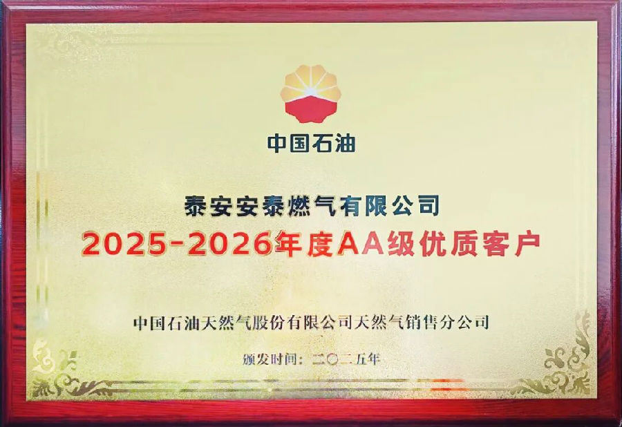 近日,泰安安泰燃?xì)庥邢薰颈恢袊吞烊粴夤煞萦邢薰咎烊粴怃N售分公司授予“2025—2026年度AA級優(yōu)質(zhì)客戶”榮譽(yù)稱號。該榮譽(yù)是中國石油對合作企業(yè)的高度認(rèn)可,更是對公司長期以來深耕能源保障、恪守契約精神、積極履行社會(huì)責(zé)任的權(quán)威肯定。