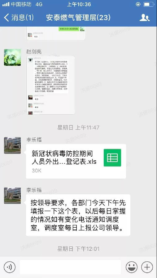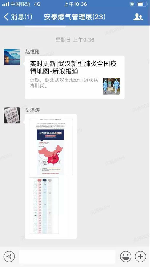 面對新型冠狀病毒疫情的嚴峻形勢,公司緊急行動,強部署、抓落實,成立“安泰燃氣新型冠狀病毒防控群”,層層推動防疫工作精準落實。公司以企業(yè)微信群等形式,發(fā)布主流媒體的相關疫情訊息及防護常識,做好輿情引導,做到不聽謠、不信謠、不傳謠,避免引起恐慌。通過正確信息,引導大家充分認識做好新型冠狀病毒防治工作的極端重要性,使大家認真了解和掌握科學預防的知識和方法,與全國人民一道攜手抗擊疫情。
